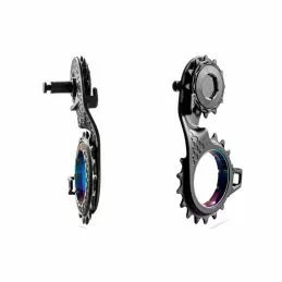 La roldana superior es de 12 dientes y la inferior, de gran tamaño, cuenta con un dentado de 18. En ambas se incorporan rodamientos cerámicos de alta calidad.